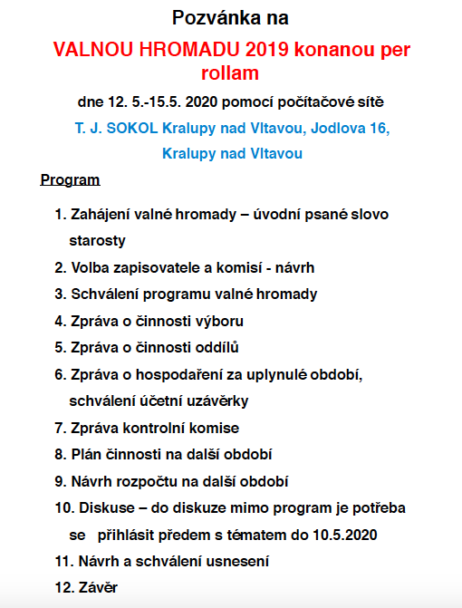 Pokud jste nebyli v rámci svého cvičení nominováni a máte zájem se Valné hromady zúčastnit, dozvědět se podstatné informace z aktuálního dění Sokola, či máte jakýkoliv dotaz, obraťte se prosím na Katku Procházkovou, která má přípravu VH na starosti (email katka.prochazkova@seznam.cz)