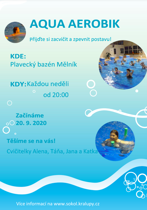 - Vodní aerobic začíná 20.9 (pernamentky ze začátku roku zůstávají v platnosti, cvičí se v mělnickém bazénu)