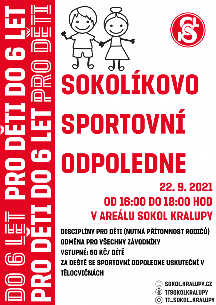 Ve středu 22.9.2021 se bude na našem sokolišti konat Sokolíkovo sportovní odpoledne. Soutěže pro děti ve věku od 2 do 6 let.
