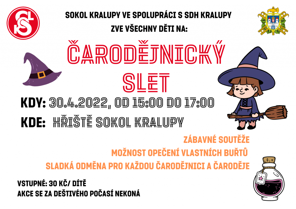 Čarodějnice na sokole Zveřejněno v 27 dubna, 202211 května, 2022 od sokol.kralupy Již tuto sobotu odpoledne proběhne na sokoláku Čarodějnický slet. Všichni jste srdečně zváni 🙂
