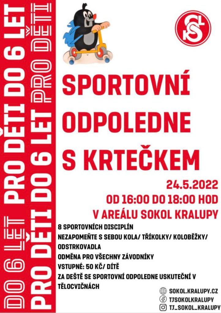 Sportovní odpoledne s krtečkem Zveřejněno v 19 května, 202219 května, 2022 od sokol.kralupy Zveme vás na Sportovní odpoledne s krtečkem, které pořádáme v úterý 24.5. od 16:00 na Sokoláku