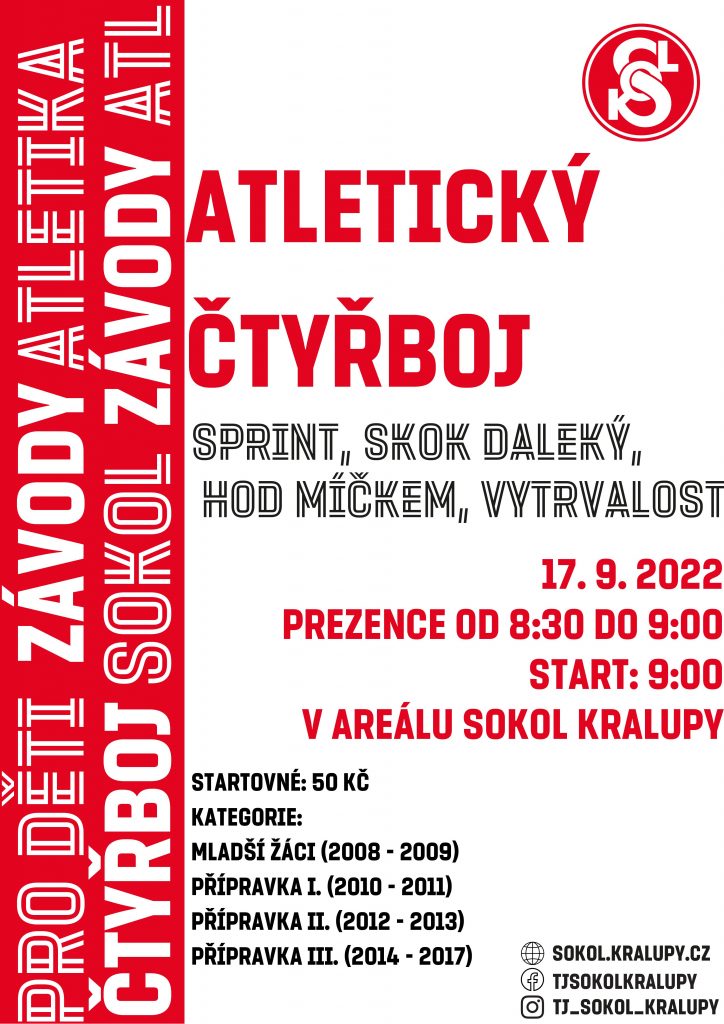 Atletický čtyřboj 17.9.2022 Zveřejněno v 4 září, 20224 září, 2022 od Tomáš Plíšek Už za 2 týdny v sobotu 17. 9. 2022 se uskuteční atletické závody, tak neváhej a přijď si užít den a poměřit své síly s ostatními. atletický čtyřboj