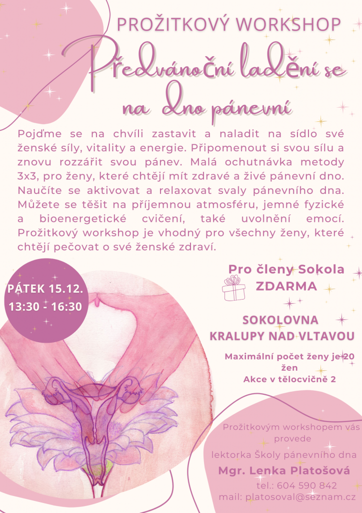Pozvánka na workshop 15. 12. 2023 Zveřejněno v 27 listopadu, 202327 listopadu, 2023 od sokol.kralupy Rádi bychom Vám pozvali na prožitkový workshop PŘEDVÁNOČNÍ LADĚNÍ SE NA PÁNEVNÍ DNO, které se uskuteční v pátek 15.12. od 13:30 až 16:30 hodin. V případě zájmu kontaktujte přímo paní magistru Platošovou.