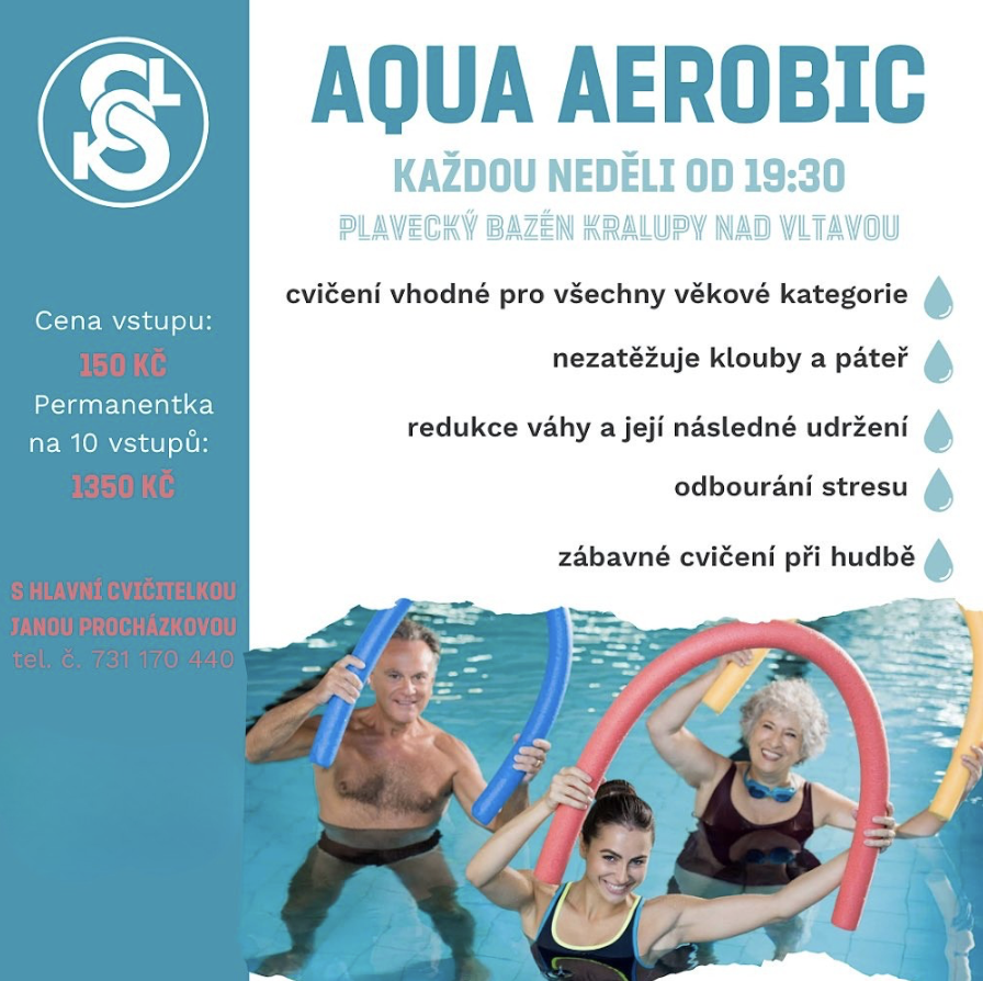 Pro koho je cvičení vhodné: Aquaerobik je vhodný prakticky pro každého: pro ženy, muže i odrostlejší děti. Voda nadlehčuje a tak při tomto cvičení není namáhán kosterní systém. Mohou si tak s námi v rámci rehabilitace zacvičit lidé po operacích, baculky a další. Nenechte se ovšem zmást – při aquaerobiku poznáte, že i ve vodě se dá pořádně zapotit. Vodní aerobik je dobrý na zpevnění postavy, při hubnutí, napomáhá ztrátě pomerančové kůže, je dobrý jako prevence na bolesti zad, bederní a krční páteře. Proč dlouho popisovat? Přijďte si to vyzkoušet…
