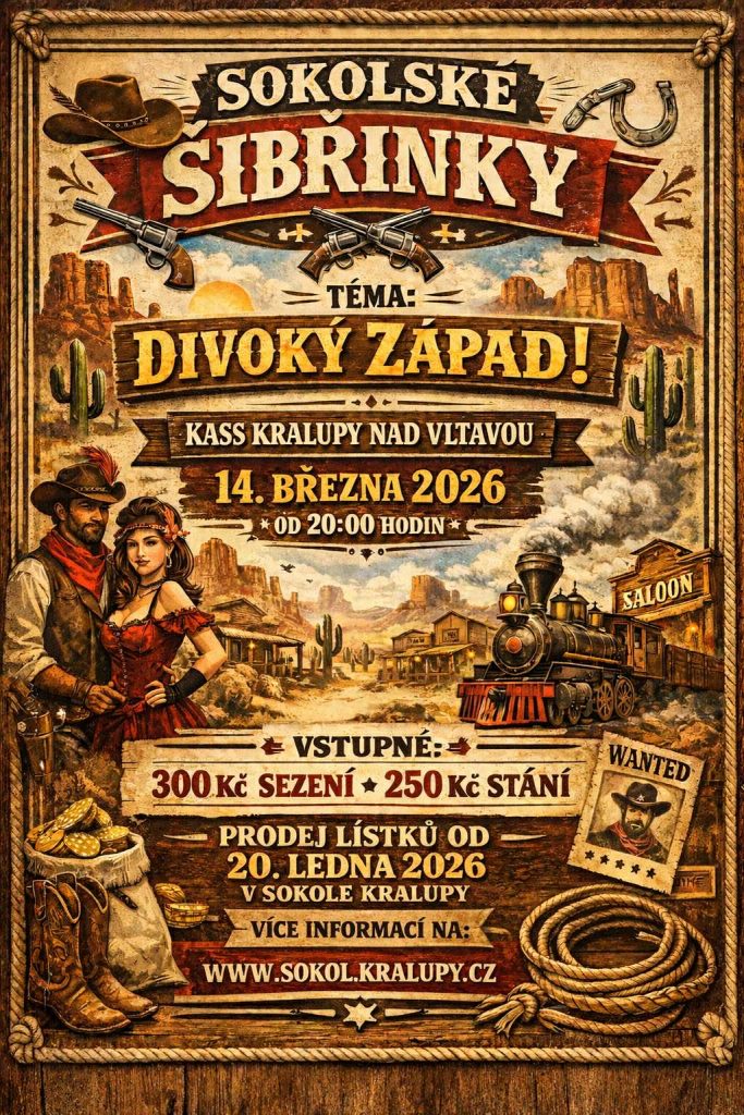 A je to tady rok 2026 a čeká nás další ročník SOKOLSKÝCH ŠIBŘINEK, tentokrát se přeneseme do poloviny 19. století, připravte se nejen na noc plnou kovbojů, indiánů, salónů, ale i hudby a tance. Obujte boty, nasaďte klobouky, čelenky a přijďte zažít Divoký západ tak trošku po Sokolsku:)
